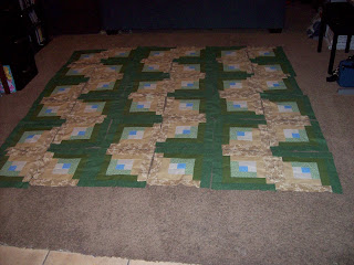 Dad has a cabin in the woods of the Wet Mountains near Westcliffe (really a nice house, but we call it a cabin). I've been wanting to make a log cabin quilt for his cabin for years. Dad's favorite colors for decorating are forest green and tan or brown. The brown section of the fabric store was a bit to dark and none of the fabrics would do the nice stepping from color to color, so I went a little more on the cream side. It will still match the furniture he stained. The blue is mostly my addition because there are so many beautiful blue sky out there.
